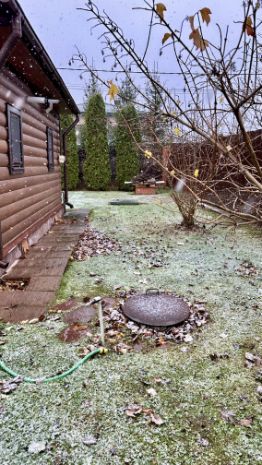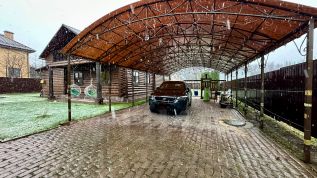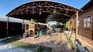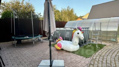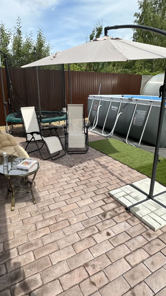 Участок 10 соток прямоугольный и ровный, ворота с пульта, навес на 4 машины, дорожки, детский комплекс, батут, бассейн, дровница.