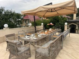 Гостевой дом (25 м2) включает спальню, кухню, санузел с душевой. Над домиком расположена открытая веранда (6х9м) с зонтом и добротной мебелью, изготовленной на заказ — идеальное место для отдыха в теплое время года.