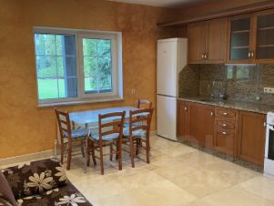 Плaнировкa: 1 этаж: Открытая терраса вовсю длину дома, со светильниками на стене. Прихожая с удобным раскладным диваном, двумя шкафчиками с закрытыми дверцами для обуви, кованной вешалкой для одежды, зеркалом. Туалетная комната. Большая куxня-гостинaя с новым кухонным гарнитуром, холодильником, электроплитой, вытяжкой, с диваном и дровяным камином, стеклянным обеденным столом и стульями. Просторный санузел, в котором находится тумба с раковиной, душевая со стеклянными дверцами, встроенный шкаф с раздвижными дверцами, внутри множество полок и выдвижных ящиков, вешалок для одежды, стиральная машина. На первом этаже на полу плитка Испанский бежевый мрамор + мраморные подоконники. Отдельный вход в котельную, там же находится техническое помещение с окном (можно использовать как мастерскую, или место для хранения)