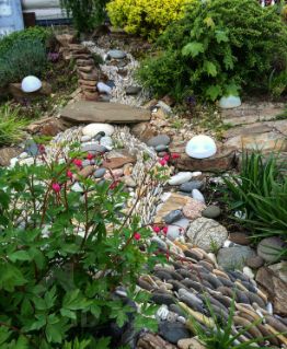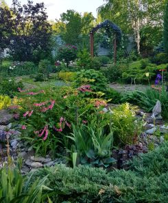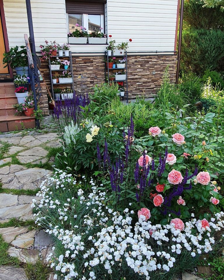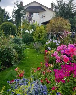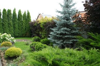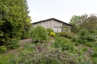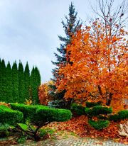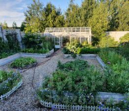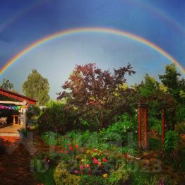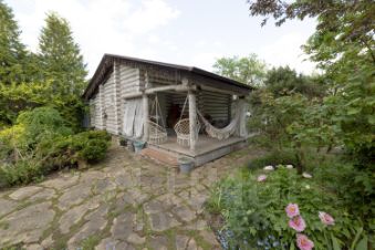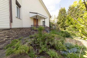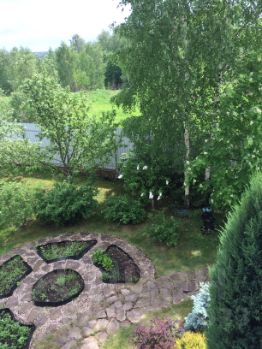 Участок украшен красивыми растениями и цветами, обустроен огородом и детской площадкой. В саду — оригинальные дизайнерские элементы, плодовая зона, огород со стеклянной теплицей и дополнительным выходом в лес. Есть автоматическая система полива.