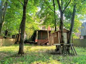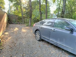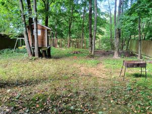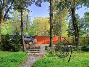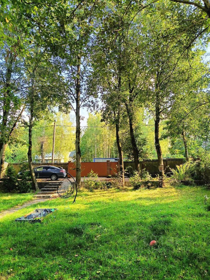 Достаточно просторный участок ( площадь 11 соток), правильной прямоугольной формы, отмежеван, по периметру огорожен забором, автоматические ворота с пультом управления. Во дворе парковка на 4 машины. На участке растут красивые лесные деревья - березы, клены и туи. ИЖС.