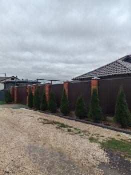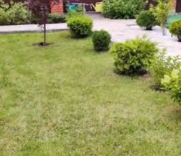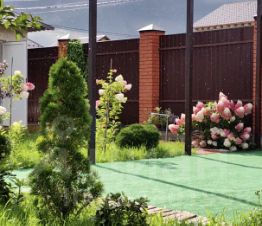 Растут туи внутри участка вдоль забора, так же на улице вдоль забора. Плодoвые посажены недавно (яблоня, черешня). Кустики смородина красная и черная, крыжовник. Много кустов гортензий, папоротники, розы и других цветов. По бокам и сзади дома есть грядки для зелени, клубника, малина.
