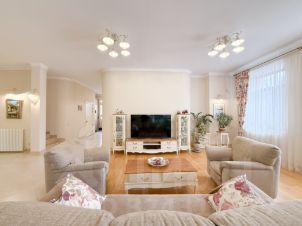 Кирпичный дом 269,8 м² с панорамным остеклением, индивидуальный проект. Стены 2,5 кирпича, железобетонные перекрытия, кровля натуральная черепица (Braas). Высокие потолки (3+ м), мраморные подоконники, все окна с видом на лес. Качественный ремонт, стильная мебель, современная бытовая техника и сантехника. Теплые полы.