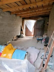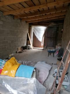 На въезде на участок построен просторный гараж из блоков с односкатной крышей. Использовался для временного проживания.