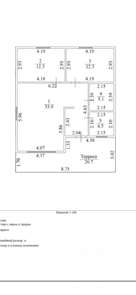2 спальни по 12,5м2 каждая, кухня гостиная 25м2, санузел 5.1м2 и бойлерная 4.5м2.