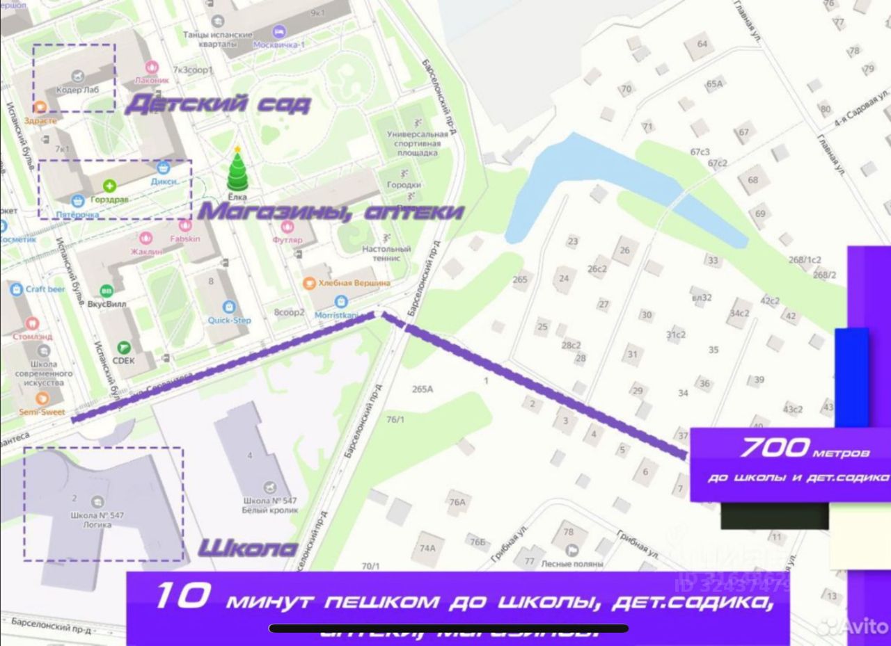 Рядом станции метро Корниловская, 1.5 км пешком по асфальтированной дороге. школа и детский сад 5 мин пешком в ЖК Испанские кварталы.