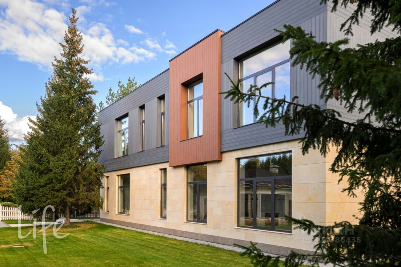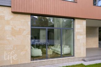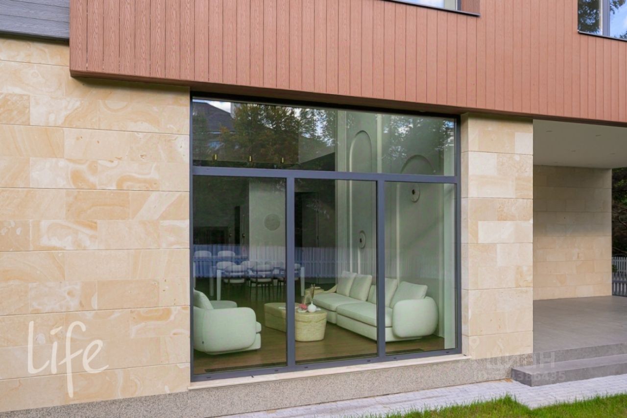 Экстерьер дома лаконичный, отделан натуральным камнем хисар и планкеном из минерального композита, панорамное остекление.