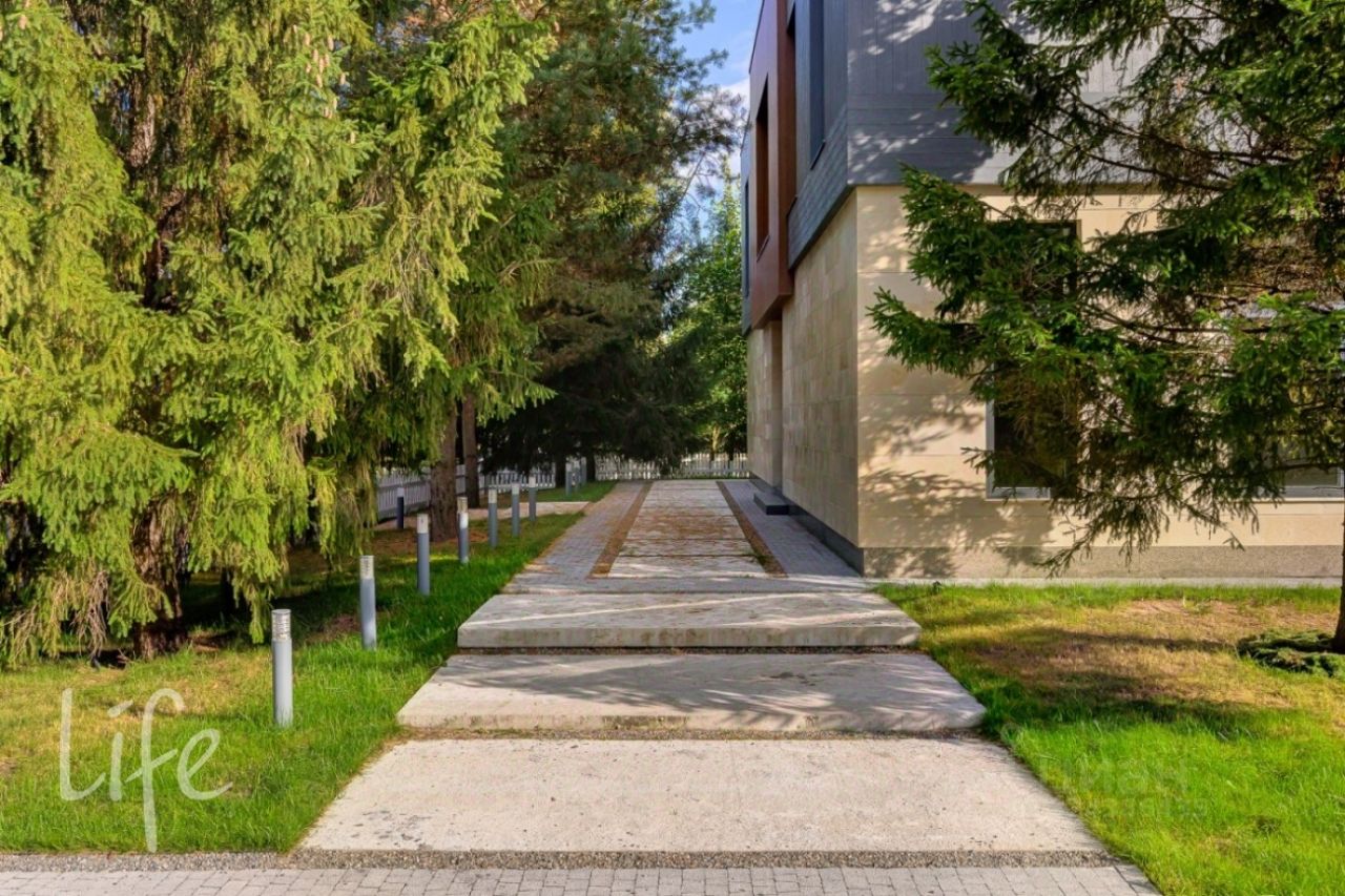 Участок правильной прямоугольной формы, выполнен ландшафтный дизайн. Газон, декоративные деревья и кустарники, ночное освещение. На территории расположен гараж на три автомобиля, с котельной и квартирой для обслуживающего персонала.
