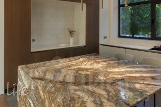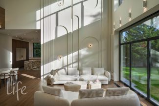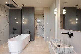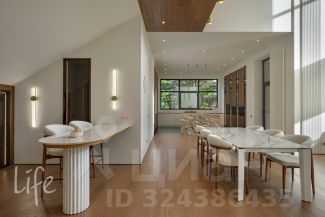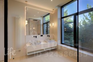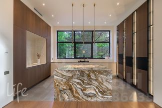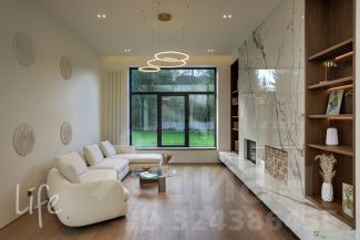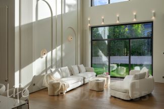 Интерьер дома выполнен в светлых тонах, гармонично сочетающихся с деревянными декоративными панелями. Со вкусом подобрана мебель и аксессуары от таких компаний, как Poliform, Natuzzi, Calligaris, BoConcept. Благодаря большим окнам в доме всегда светло и уютно. Гостиную украшает дровяной камин. Современная система освещения.