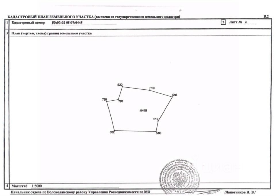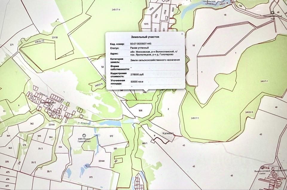 Продается земельный участок по адресу; Московская обл, р-н Волоколамский, с/пос. Ярополецкое, р-н д. Голоперово ) / Кадастровый номер 50:07:0020507:445/ 50.000 кв.м., Разрешенный вид использования: Для ведения крестьянского (фермерского) хозяйства. Перспективное живописное место, обеспечивающее идеальные рекреационные свойства района, удобный подъезд с Новорижского шоссе, вся инфраструктура города Волоколамска.