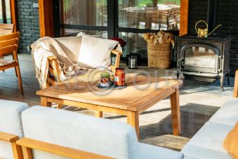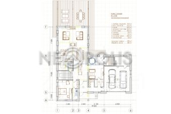 На первом этаже — прихожая, гардеробная, кухня-столовая, большая гостиная с двусторонним камином. Это центр дома: здесь собираются, отдыхают, принимают гостей. Из гостиной — прямой выход на террасу, где утром можно пить кофе, а вечером — устраивать ужины. На этом же этаже — гостевая спальня с собственной ванной, сауна, комната отдыха, душевая, отдельный санузел, постирочная, котельная и тёплый гараж на два автомобиля.