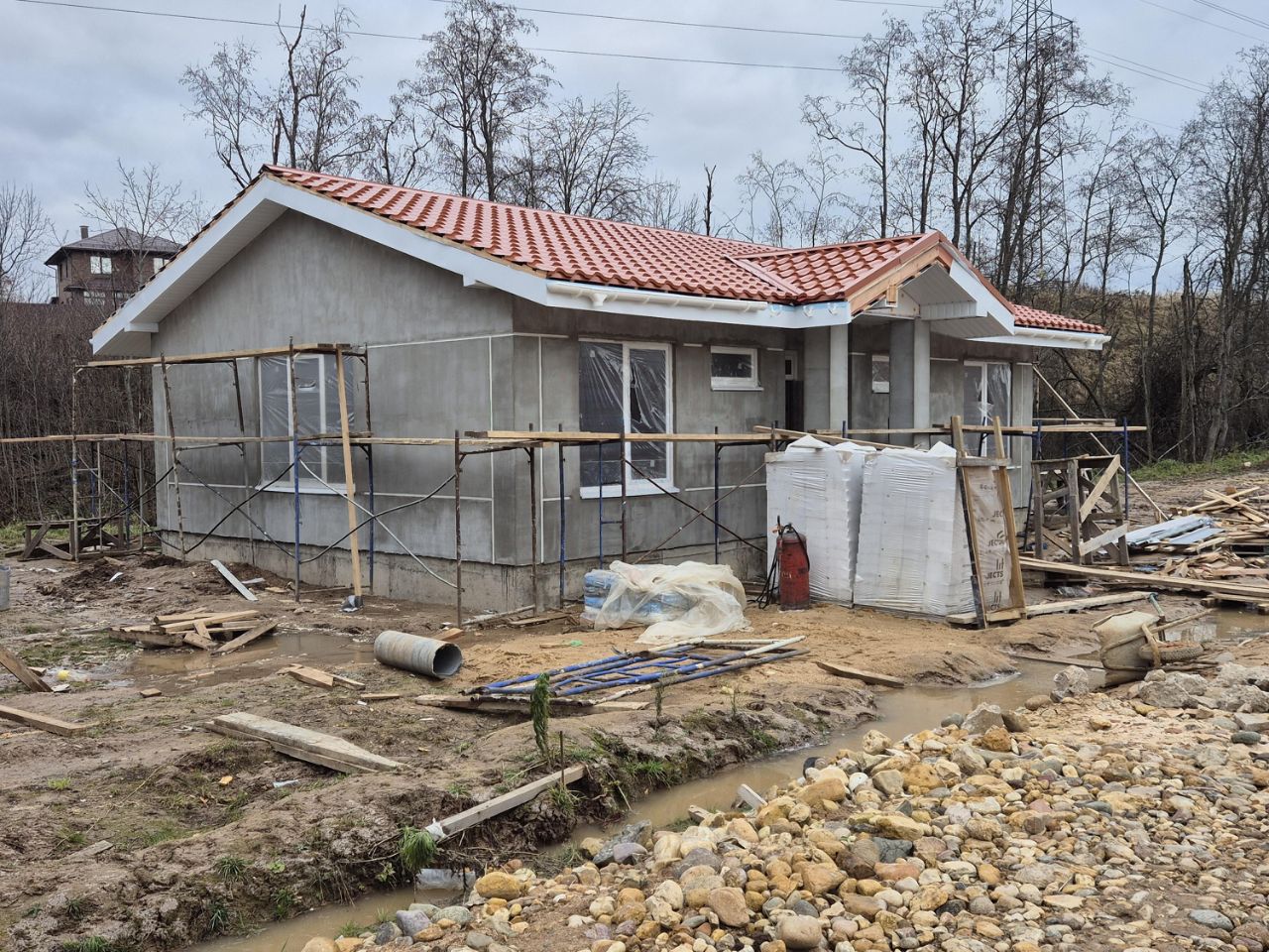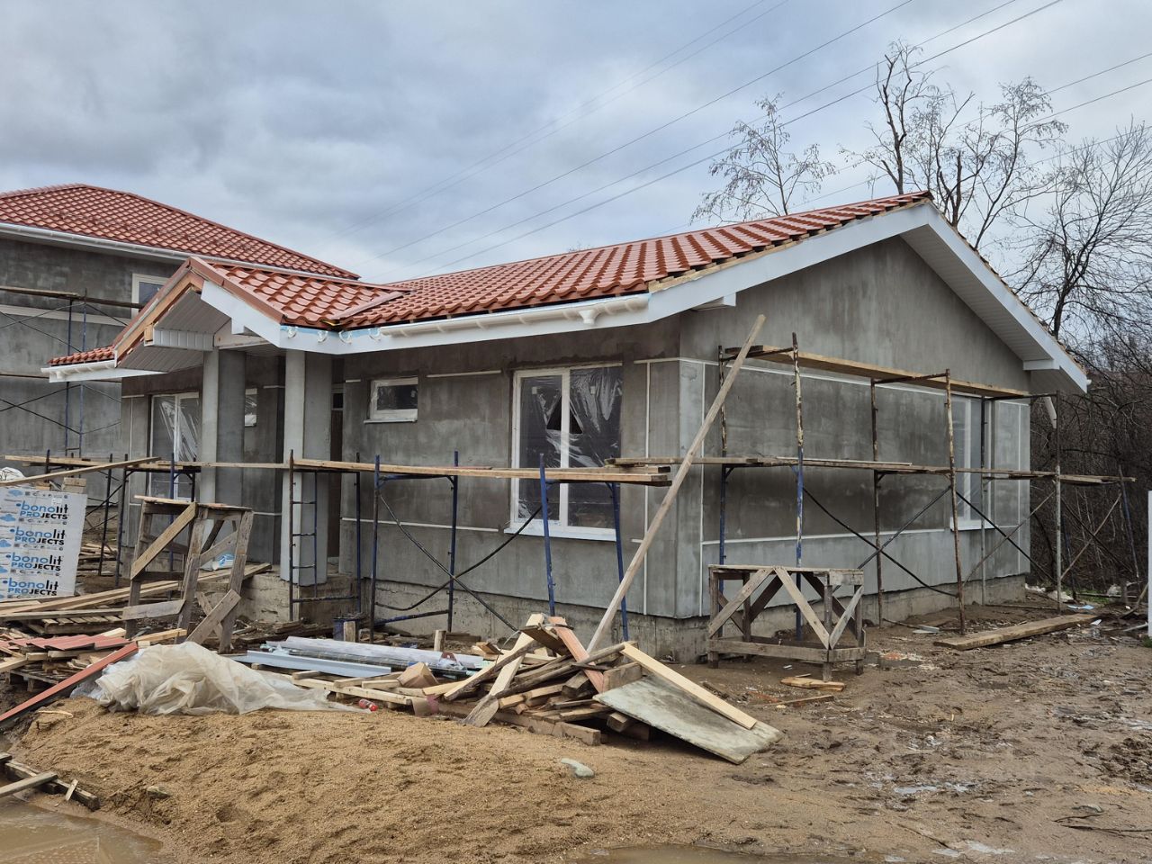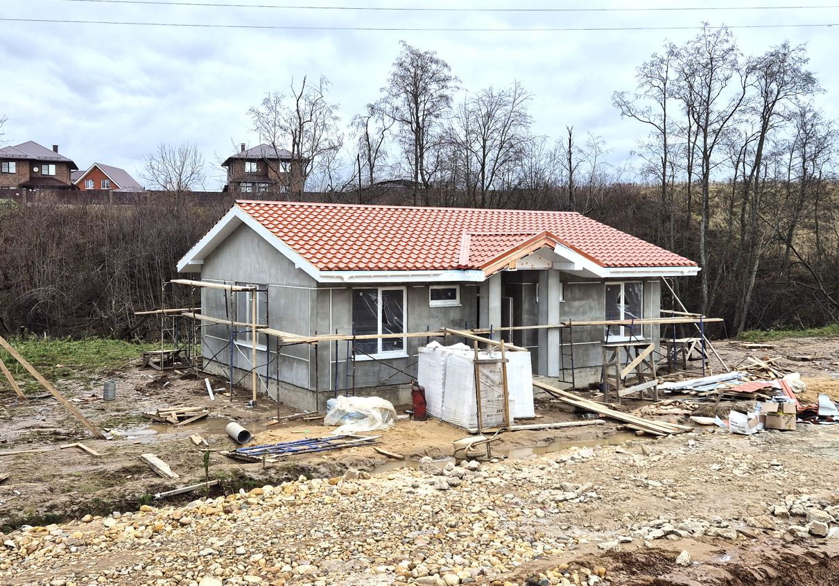 Материал стен газобетонные блоки Бонолит d500, отделка фасада декоративная штукатурка. Внутренняя отделка: межкомнатные перегородки согласно проекту. Фундамент свайный ростверк + монолитная жб плита+монолитные входные ступени, крыша - металлочерепица, огнебиозащита стропильной системы, утеплитель кровли базальт, софиты, водосточная система, снегозадержатели, качественные окна пвх 3 стекла, металлическая входная дверь. Высокое качество строительства с применением качественных строительные материалы. Дом дополнительно можно укомплектовать террасой.
