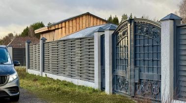 • Фундаментальный забор 3+ м: фундамент, кирпичные торцы, деревянное плетение.