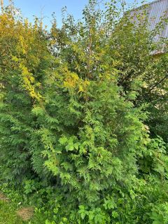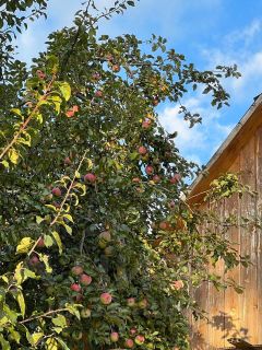 Сам участок облагорожен, посажен ровный газон, также имеются 4 яблони, сливы, абрикос, кустарники (малина, крыжовник, смородина) и много пионов. Здесь можно загорать, качаться на гамаке или качелях, наслаждаться видами или сесть на велосипед и поехать в лес, на канал.