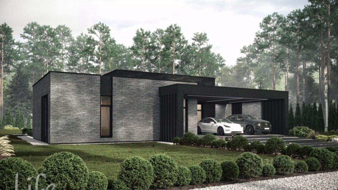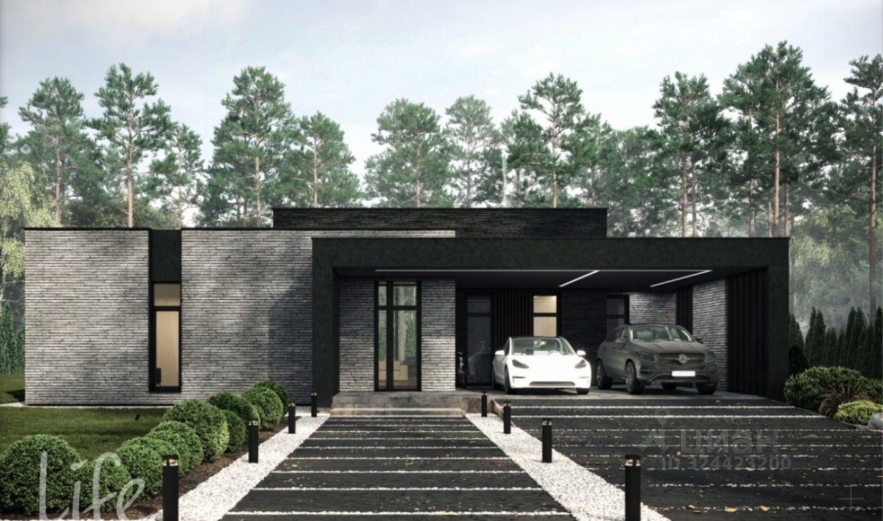 В сторону улицы обращены вход в дом и парковка на два автомобиля, объединенные единым массивным навесом-козырьком.