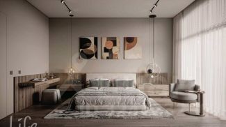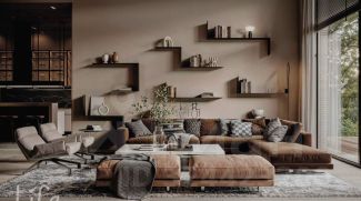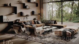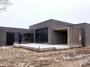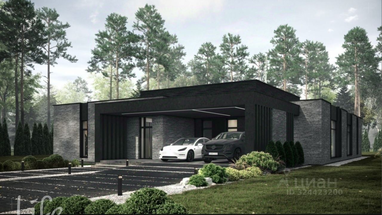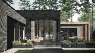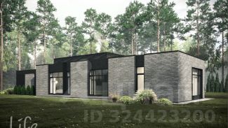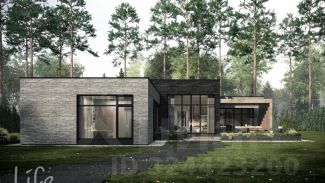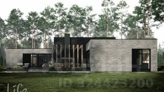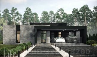 Дом представляет собой компактное одноэтажное разно-высокое здание в модном современном стиле с плоской кровлей и панорамным остеклением. Общая площадь застройки - 458 кв. м.