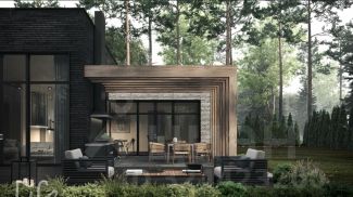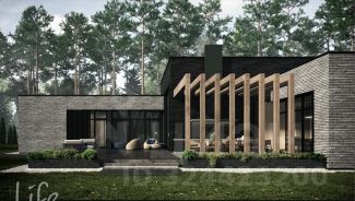 Продолжением дома является опоясывающая просторная открытая терраса с зоной барбекю, перекрытой декоративной перголой.