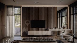Основное жилое пространство дома включает в себя кухню с островом, столовую и гостиную с каминной зоной, все эти зоны объединены между собой и обращены вглубь участка. Высота потолков в этой части дома 4,5 метра, оконные проемы начинаются прямо от пола, что обеспечивает большую освещенность в дневное время и визуально расширяет пространство.
