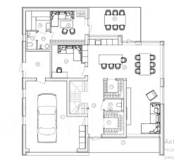 1 этаж - просторная кухня-столовая с выходом на террасу и баню с комнатой отдыха, гостиная с камином, кабинет/спальня, выход в гараж, санузел, котельная