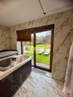 светлая гостиная с камином, кухня, прихожая, кладовка, санузел с душевой, джакузи на четверых, баня.