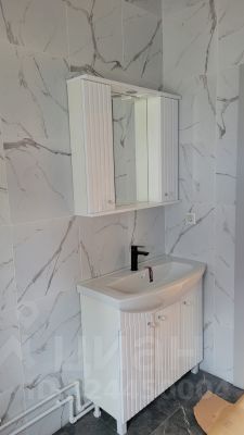 Ванная комната выложена плиткой и установлена сантехника и мебель.