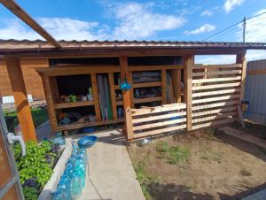 Бытовка с навесом и местом под дрова, не покупная, строили сами.