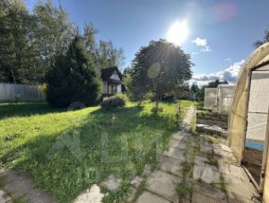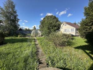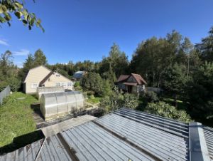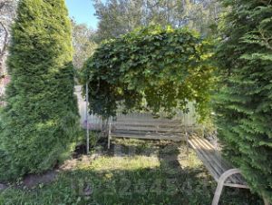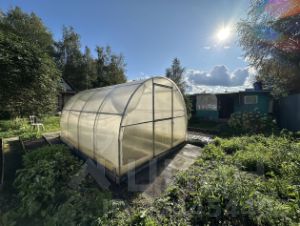 2 парника, грядки, много цветов, деревьев, в том числе елки, туалет.