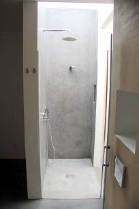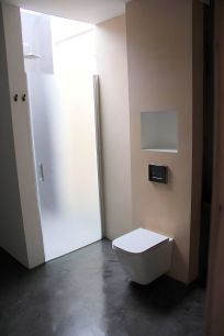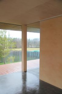 —напольное покрытие: микроцемент в жилой зоне ( теплые полы) и лиственница на террасе