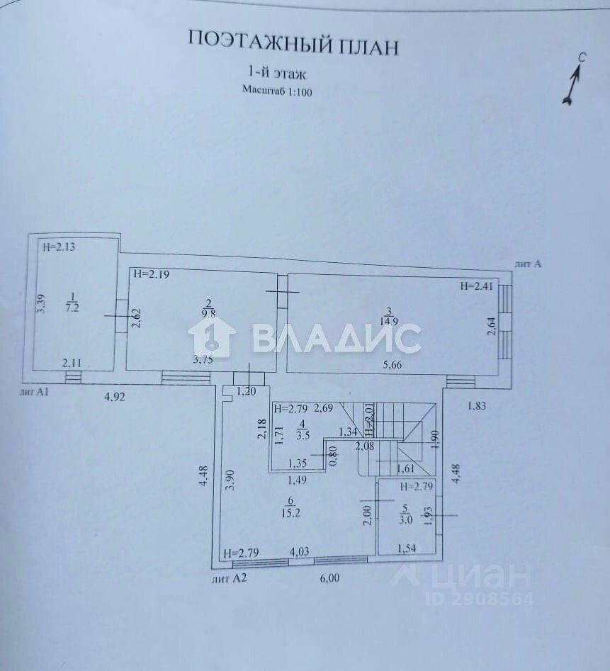 1 этаж: прихожая, кухня, столовая, две комнаты 15 и 7,2 кв.м., с/у.