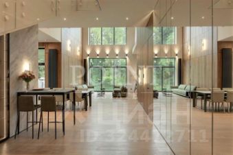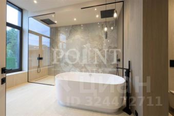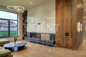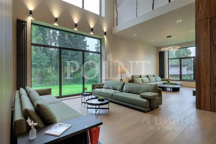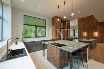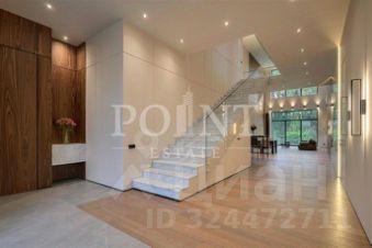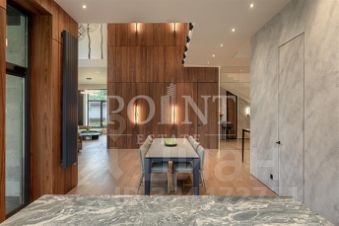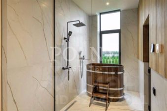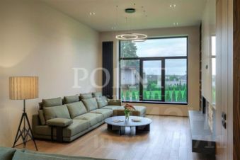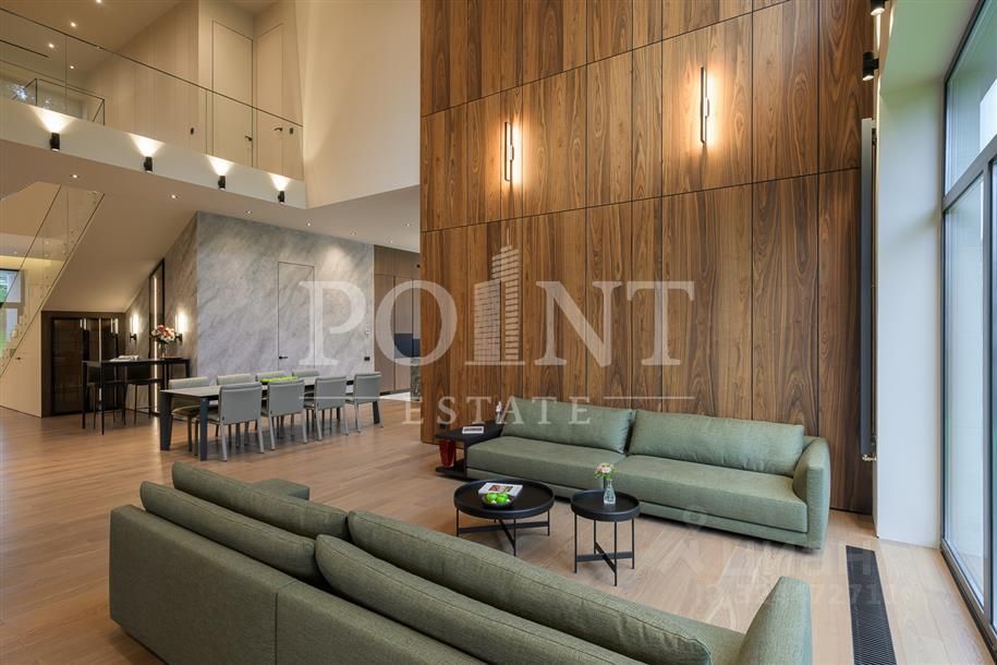 В доме большая площадь остекления, а также великолепные виды из окон на все 4 стороны. В доме четко выделены и обособлены 4 функциональные зоны: входная группа, общественная зона, приватная зона и техническая зона с отдельным входом. Входная группа: холл, гардеробная верхней одежды, гостевой блок 2 спальни, гостевой санузел с душевой, гостевая гардеробная и кабинет. Общественная зона: Гостиная-столовая-кухня - единое пространство со вторым светом, общей площадью 115 м2. Окна этого пространства смотрят на восток, юг и запад. Блок свободного назначения с санузлом и сауной. Крытая терраса с видом на лес с доступом из кухни и столовой. Хозяйский санузел первого этажа, оснащенный умывальником, унитазом, биде и писсуаром. Приватная зона: мастер сьют, три детских сьюта площадью, прачечная.