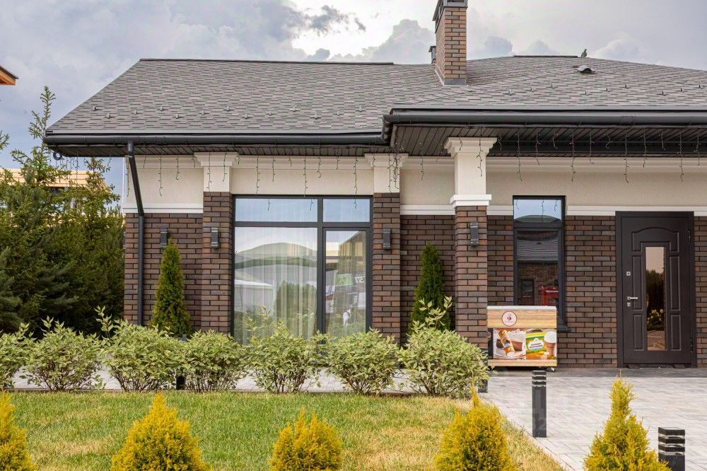 Остекление дома из двойного стеклопакета трехкамерный профиль REHAU BLITZ 60 мм. Ламинация окон серый RAL 7024. Окна в кухне-гостиной и в спальных комнатах в пол (высота оконных проемов 2,400 мм).