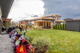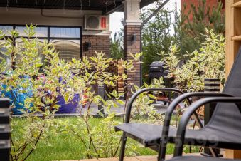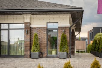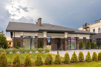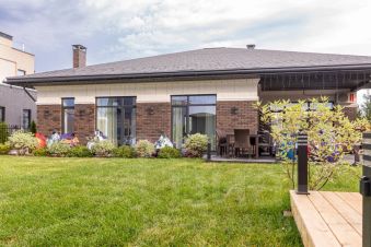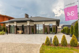 Одноэтажный дом на 166,55 м2. На этаже расположены: прихожая, холл, кухня-гостиная, два санузла, четыре спальных комнаты, гардероб, крыльцо, терраса, патио, джакузи, кладовая.