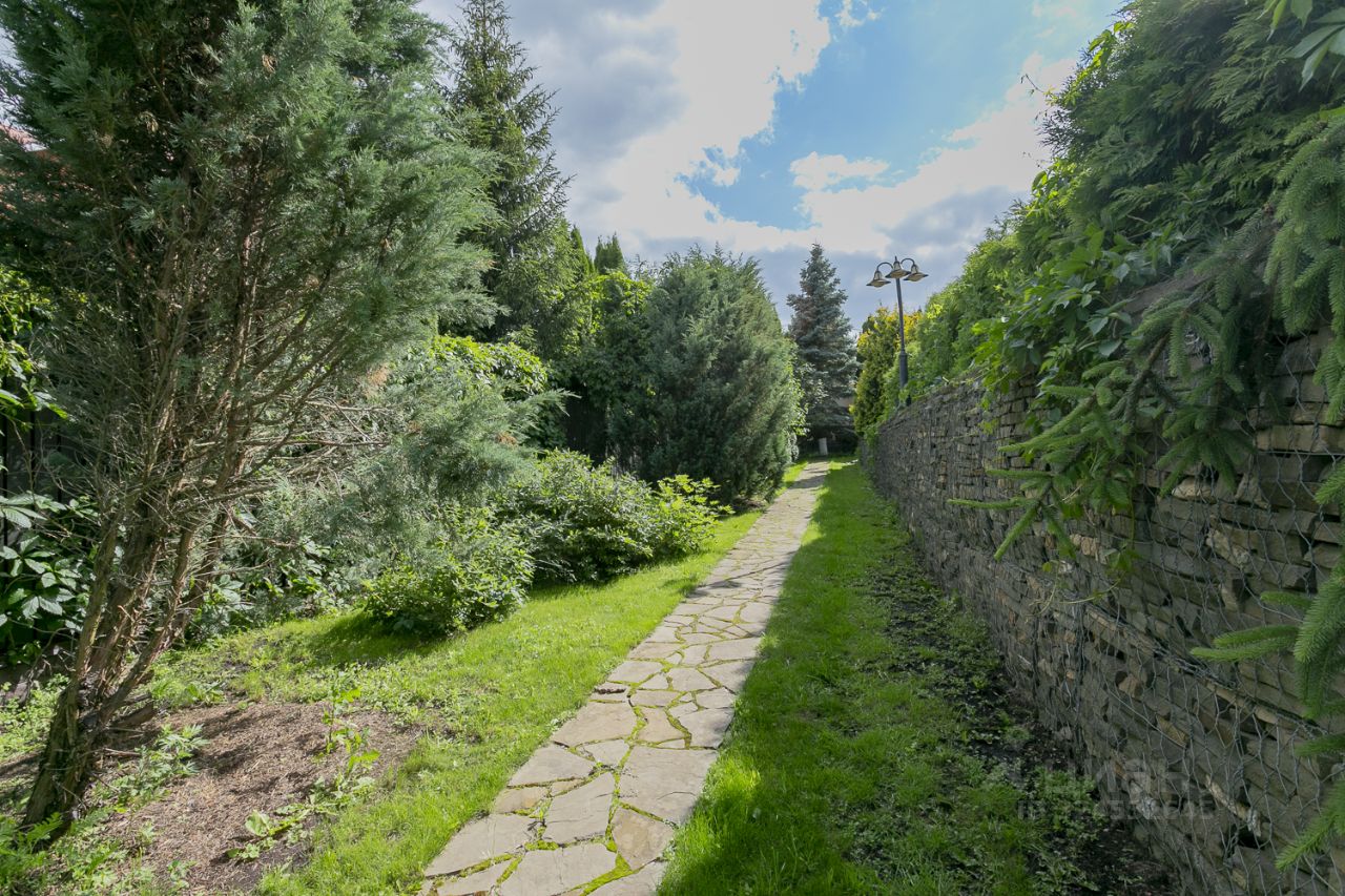 Участок утопает в зелени: высокие туи, голубые ели, березы, можжевельник, цветы и кустарники. Дорожки из декоративного камня создают атмосферу уюта. Есть место для установки каркасного бассейна.