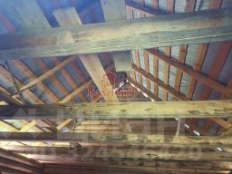 Выполнен из сруба, по внешнему периметру 6х6. Сруб установлен в 2022 году из бревна, привезённого из Мордовии. Фундамент - глубокий ленточный.