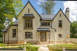 Дом сочетает элегантность традиционного стиля и высокое качество строительных материалов. Стены возведены из кирпича, цоколь, терраса, крыльцо, дорожки выполнены из травертина, крыша- фальцевая кровля, все двери и стеклопакеты в доме- из натурального дерева.