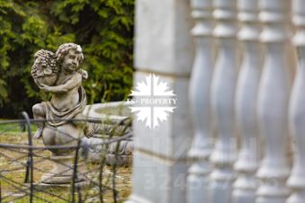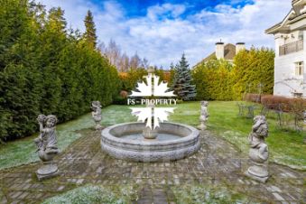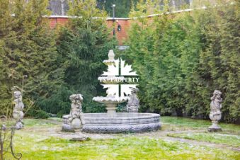 Продуманный ландшафтный дизайн превращает участок в настоящий оазис элегантности: в центре композиции раскинулся изысканный фонтан с четырьмя скульптурами, наполняя пространство журчанием воды и классической гармонией форм.