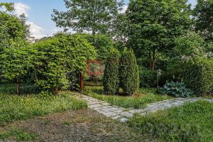 Фасад выполнен из натурального камня. Территория вокруг дома утопает в зелени — на участке разбит двухъярусный сад, установлено уличное освещение. По периметру высажены деревья и кустарники, скрывающие участок от взглядов посторонних. Все растения собраны в ландшафтную композицию.