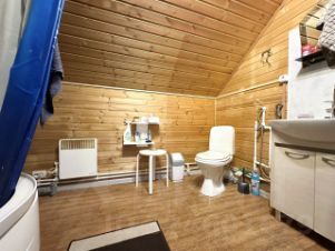 На 1-м этаже расположены: просторный холл, кухня гостиная, топочная и санузел. Также на первом этаже есть просторная комната со своим санузлом, но с отдельным входом., так как собственники планировали это как гостевая студия.