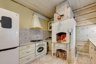 Первый этаж: зал с двойным светом объединен с просторной кухней, где сложена настоящая РУССКАЯ ПЕЧЬ. Гостевой санузел с душевой, спальня, современная котельная совмещенная с прачечной и с/у.