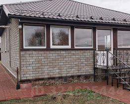 Дом построен по каркасной технологии с соблюдением строительных норм, на ленточном фундаменте. Утепление выполнено перекрестным методом (200 мм по всему периметру, включая пол и потолок), что гарантирует энергоэффективность в любое время года. Фасад облицован мягкими панелями Хауберг, исключающими теплопотери, крыша покрыта металлочерепицей с водосточной системой. Планировка этажа включает кухню-гостиную, три отдельные комнаты, холл, санузел и бойлерную