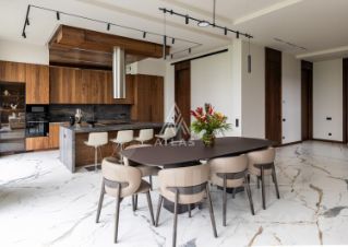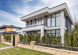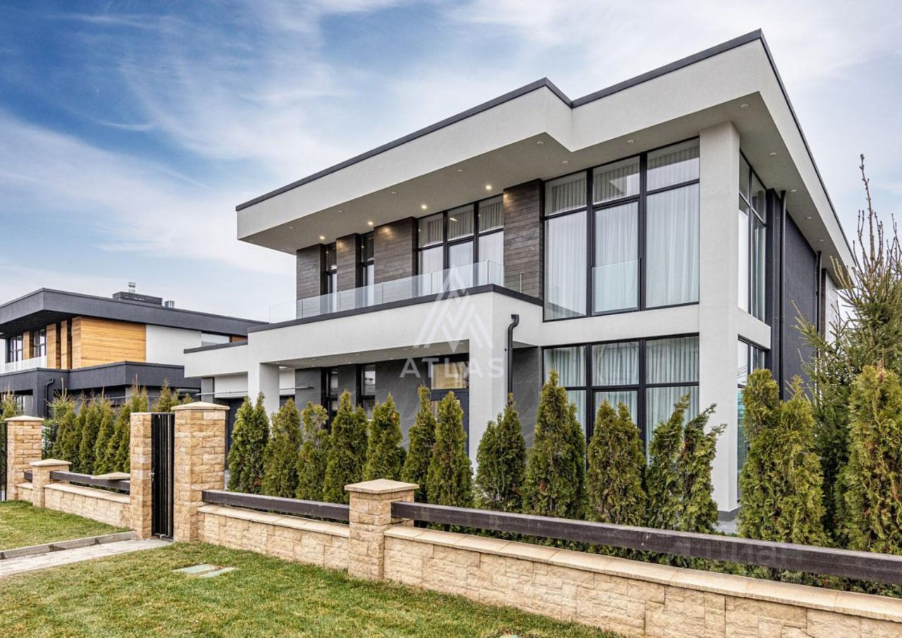 Дом площадью 437 м² с 5 спальнями расположен на участке 8 соток в коттеджном посёлке Миллениум Парк. Чёткая геометрия фасадов, плоская кровля и большие окна формируют спокойный ритм линий, который продолжается внутри дома.
