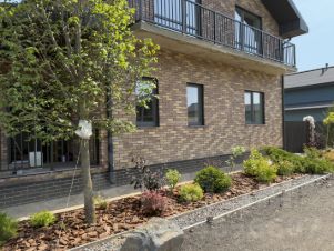 Участок 8 соток полностью облагорожен - парковка для авто, отмостка и дорожки на участке выполнены из камня, постелен шикарный рулонный газон из мятлика, посажены хвойные растения из питомника.