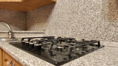 Кухня оборудована всем необходимым: холодильник, телевизор, микроволновая печь и современная газовая плита с духовкой.