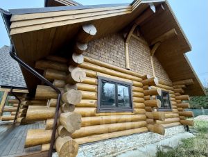 Материал дома: цельные бревна из северной сосны. Каждое бревно буквально со своей историей. Чтобы стать частью этого дома, деревья росли около ста лет, некоторые и более, были спилены под корень зимой в мороз на глубине до полутора метров, далее обработаны, высушены, выдержанны в течении нескольких лет и только после этого с ювелирной точностью собранны в единую композицию.