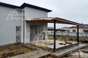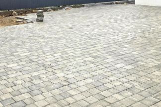 Благоустройство участка: участок освобождён от деревьев и выровнен. Выполнена укладка брусчатки: оборудована парковка перед домом и проложены дорожки.