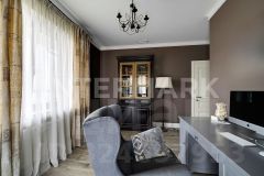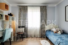 В доме на 1 этаже оборудованы: прихожая и холл с гардеробом, гостиная-столовая с выходом на террасу, комфортная кухня, две гостевые спальни и санузел с душевой. На 2 этаже: мастер-спальня с гардеробной, кабинет с выходом на террасу, две спальни и просторная ванная комната. В цокольном этаже расположены вспомогательные бытовые и технические помещения.