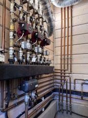Система отопления на базе напольного газового котла Buderus с max мощностью 44 КВт , подключённого к магистральной системе газоснабжения, а также укомплектована резервным электрическим отопительным котлом Protherm.
