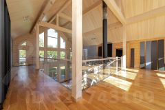 1 этаж: гостиная-столовая со вторым светом, каминный зал, застекленная веранда с барбекю, 2 спальни, каждая - с ванной и гардеробной, гостевой с/у, кладовая, 2 гардеробные;