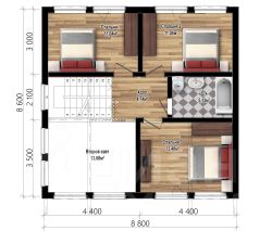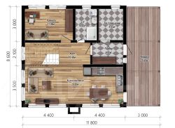 1ий этаж: кухня-гостиная с выходом на просторную террасу, тамбур, гостевая спальня, с/у и техническое помещение, которое дополнительно можно использовать как постирочную.