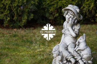 Продуманный ландшафтный дизайн превращает участок в настоящий оазис элегантности: в центре композиции раскинулся изысканный фонтан с четырьмя скульптурами, наполняя пространство журчанием воды и классической гармонией форм.